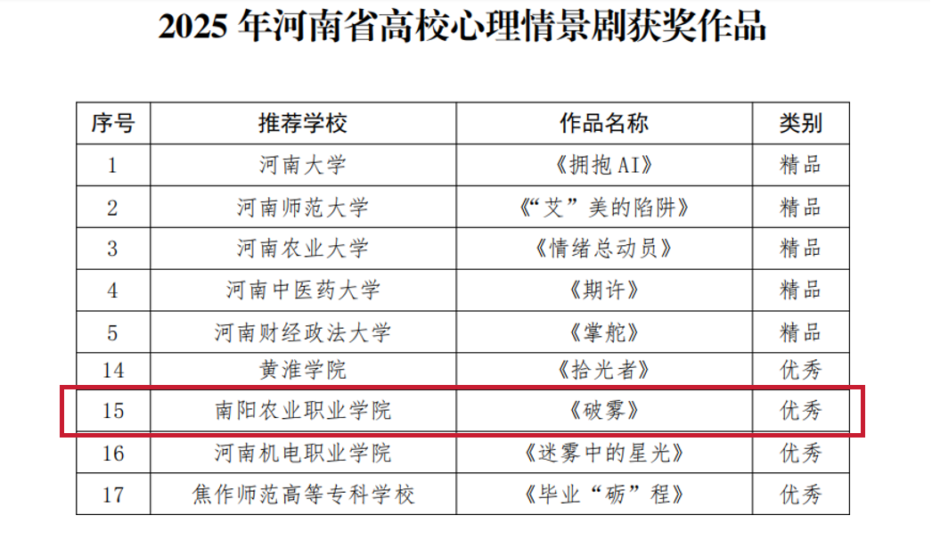 近日,河南省教育厅公布了2025年度全省高校心理情景剧作品遴选结果,我校心理咨询中心教师郭天满、张建指导的心理情景剧《破雾》获评“优秀”作品。