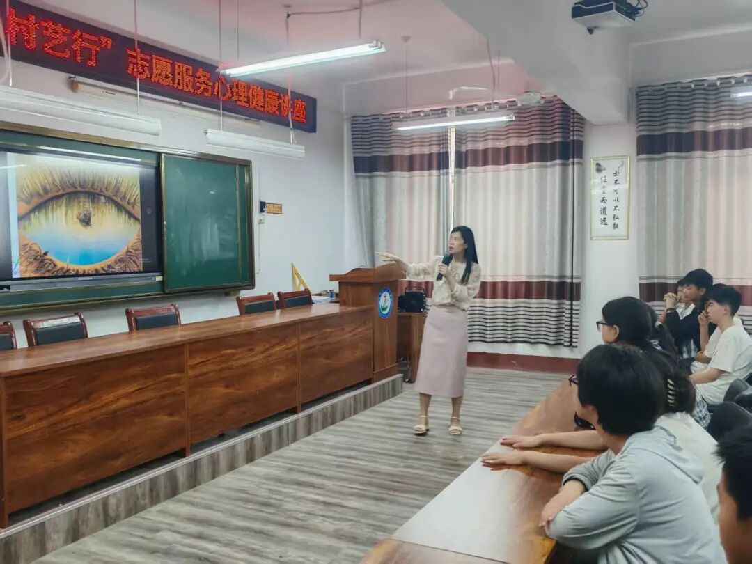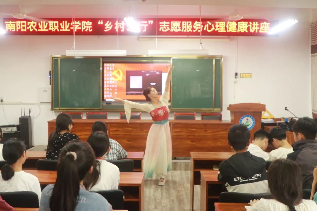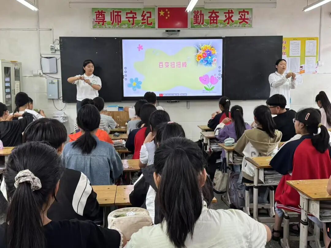 针对云阳镇第二中学初中生多为留守儿童,存在性格害羞、学业压力等问题,心理健康专业师生与音乐专业师生联动,打造了 “心理疏导 + 舞蹈互动” 的特色课程。课堂上,志愿者先通过 “压力树洞”“情绪拼图” 等环节,引导学生敞开心扉,倾诉成长烦恼;随后在节奏舒缓、动作简单的舞蹈片段教学中,让学生在肢体舒展中释放压力,在集体互动中逐渐打破内心壁垒。